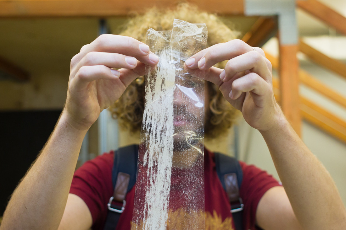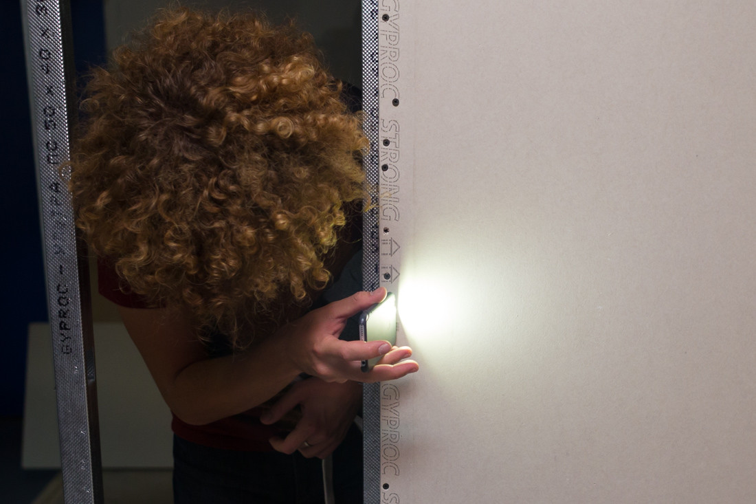 Теперь спустимся в испытательный центр, чтобы изучить листы в деле. С помощью фонарика проверяем, насколько ровная поверхность. Это лист гипсокартона другого производителя, поверхность у него неровная. Проверил разные листы, случайно вынутые из большой стопки.