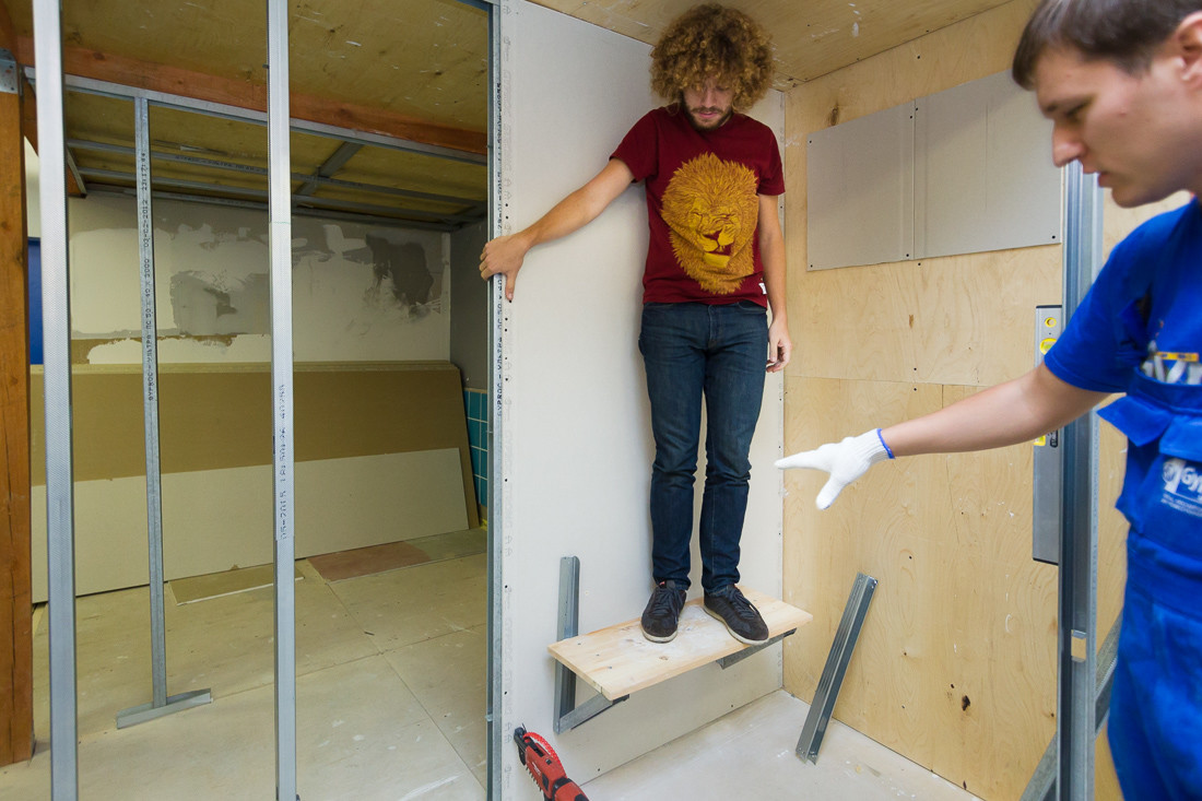 Эта конструкция - имитация кухонного шкафа. Смертельный номер! 180 кг тоже держит. Отвалилась полочка только когда мы одновременно на ней подпрыгнули. То есть, Михаил может смело вешать на этот гипсокартон качели и качаться. Главное много не есть, больше 180 кг мы не испытывали ;)