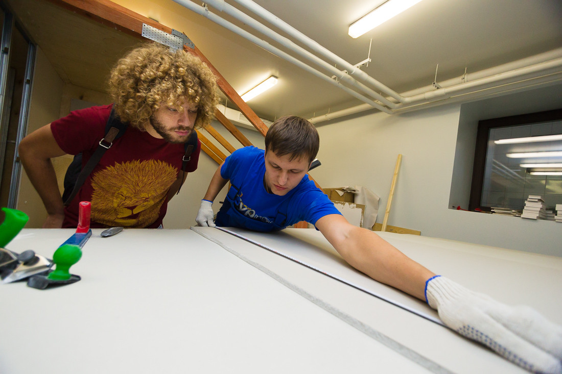 Так называемая "Академия" - это шоурум и центр, где можно испытать продукцию компании, а также научиться правильно ей пользоваться. Вот, кстати, все виды гипсокартона, которые они делают.