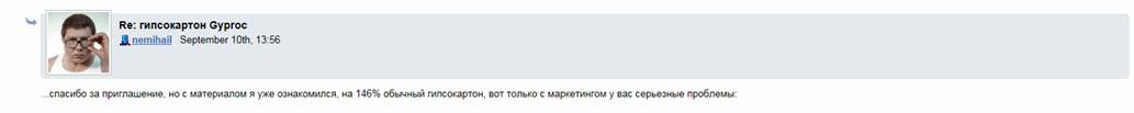 Блогера этого вы хорошо знаете, это Михаил, который nemihail. Я его, кстати, сам читаю и вам рекомендовал. Так вот, чувак опубликовал в своем блоге драму в двух частях о том, как он покупал себе гипсокартон. В начале Михаил Немихаил пришел на строительный рынок и возмутился тем, что там продают лист гипсокартона с отломанным уголком. Дальше он, несмотря ни на что, изучил этот гипсокартон и рекламные материалы компании-производителя с прорабом и остался крайне недоволен.