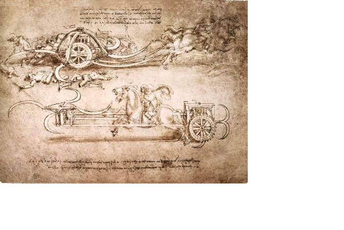 Со всех сторон убийственной колесницы Леонардо свисали косы. Она должна была действовать по принципу газонокосилки – прорывать ряды кавалерии и пехоты, скашивая ноги противникам. Судя по сопровождающим эскиз рисункам, колесница Леонардо могла стать самым смертоносным оружием Возрождения.