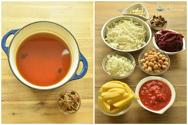 Затем идёт капуста, грибы, фасоль, лук, буряки с томатом. Варим до готовности.