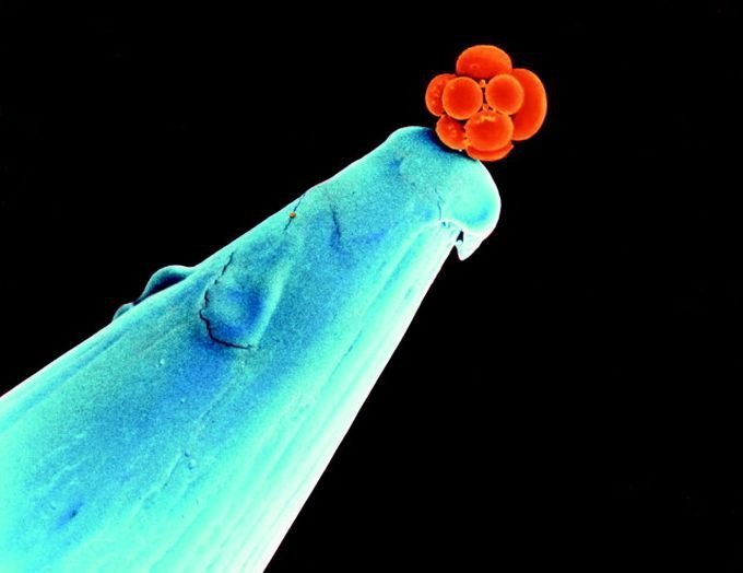 Это человеческий эмбрион в возрасте трех дней. В это время он состоит всего из 16 клеток и умещается на кончике иглы.