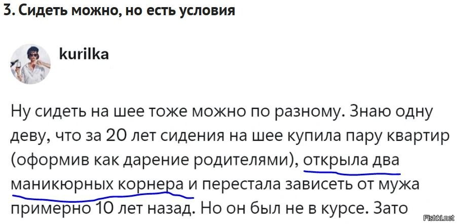 Сидеть на шее мужа даже закон позволяет. Правда, когда жена в отпуске по уходу за ребёнком находится. А по его завершении можно постепенно возвращаться в обычный мир, ведь малыш подрастает, и снова можно работать, заниматься спортом, хобби и не только. Но не все туда стремятся, предпочитая оставаться исключительно хранительницей очага. Пользователи схлестнулись в нешуточном споре, ведь эта медаль, как известно, имеет две стороны.