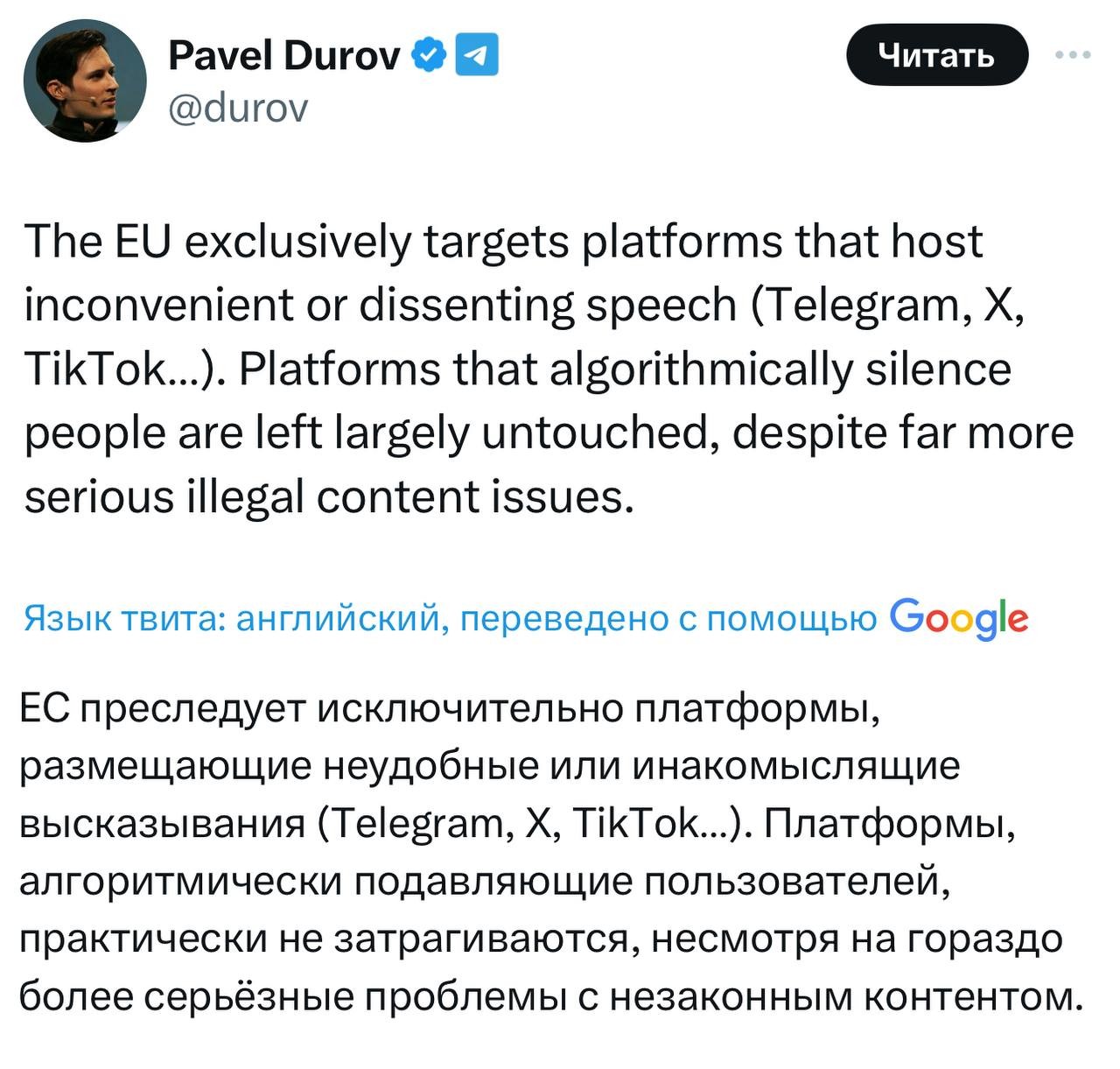 Следом проснулся Павел Дуров и выложил скриншоты переписки, где европейские чиновники предлагали X «тихонько цензурировать неугодных политиков и блогеров», а взамен обещали не штрафовать. Другие платформы, по его словам, согласились, а вот X нет. Дуров добавил, что французы проделывали то же самое с Telegram, только вместо денег предлагали закрыть уголовное дело в обмен на «помощь» на выборах в Румынии и Молдове.