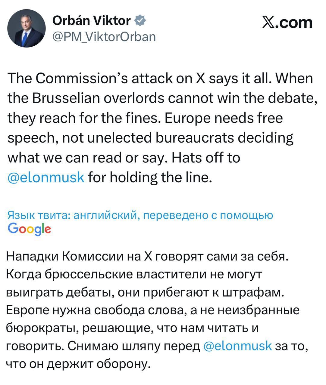 И вот, пока Брюссель пытается придумать, как объяснить гражданам, что штраф был «за прозрачность», Маск, Дуров, Рубио, Орбан и Медведев уже стоят плечом к плечу в одной группе под названием «ЕС? Не слышали». Евросоюз, похоже, сам нашёл самый быстрый способ объединить всех, кто его ненавидит. За сто двадцать миллионов евро — вполне себе выгодная сделка.