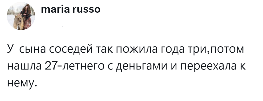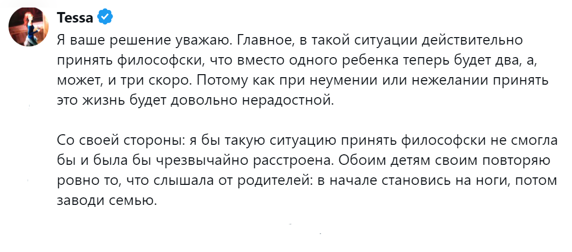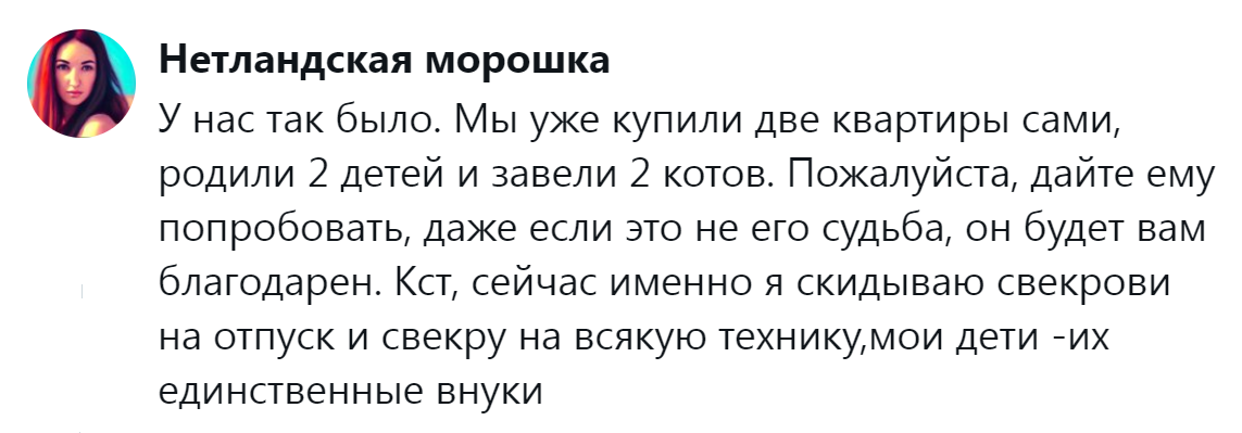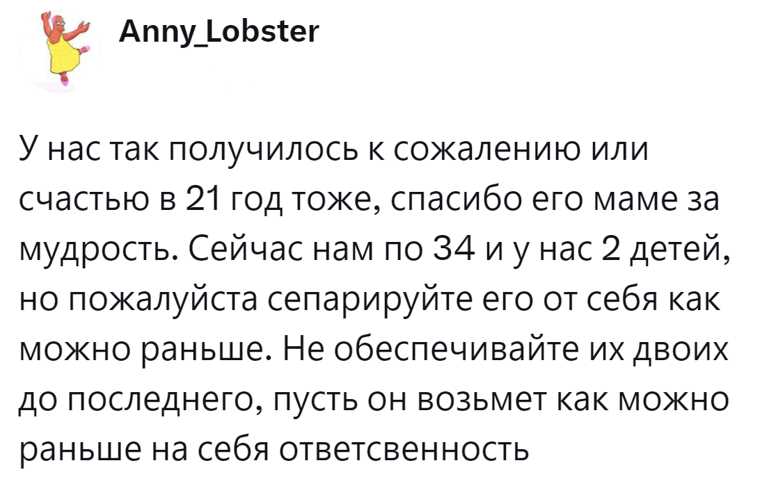 Тем более что для более инфантильного поколения зумеров нормально привести эту самую любовь домой, не имея чётких планов касаемо дальнейшего совместного существования. Молодежь понять можно, всё-таки любовь. А насущные материальные и бытовые проблемы можно оставить старшему поколению, которое тихо обалдевает, готовится взвалить на себя дополнительную ответственность и делится наболевшим с товарищами по несчастью (или счастью?) в Сети.