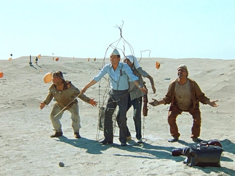 Данелия не случайно выбирает именно пустыню. Это пространство, где невозможно спрятаться, где всё обнажено до предела. Здесь нет места иллюзиям.