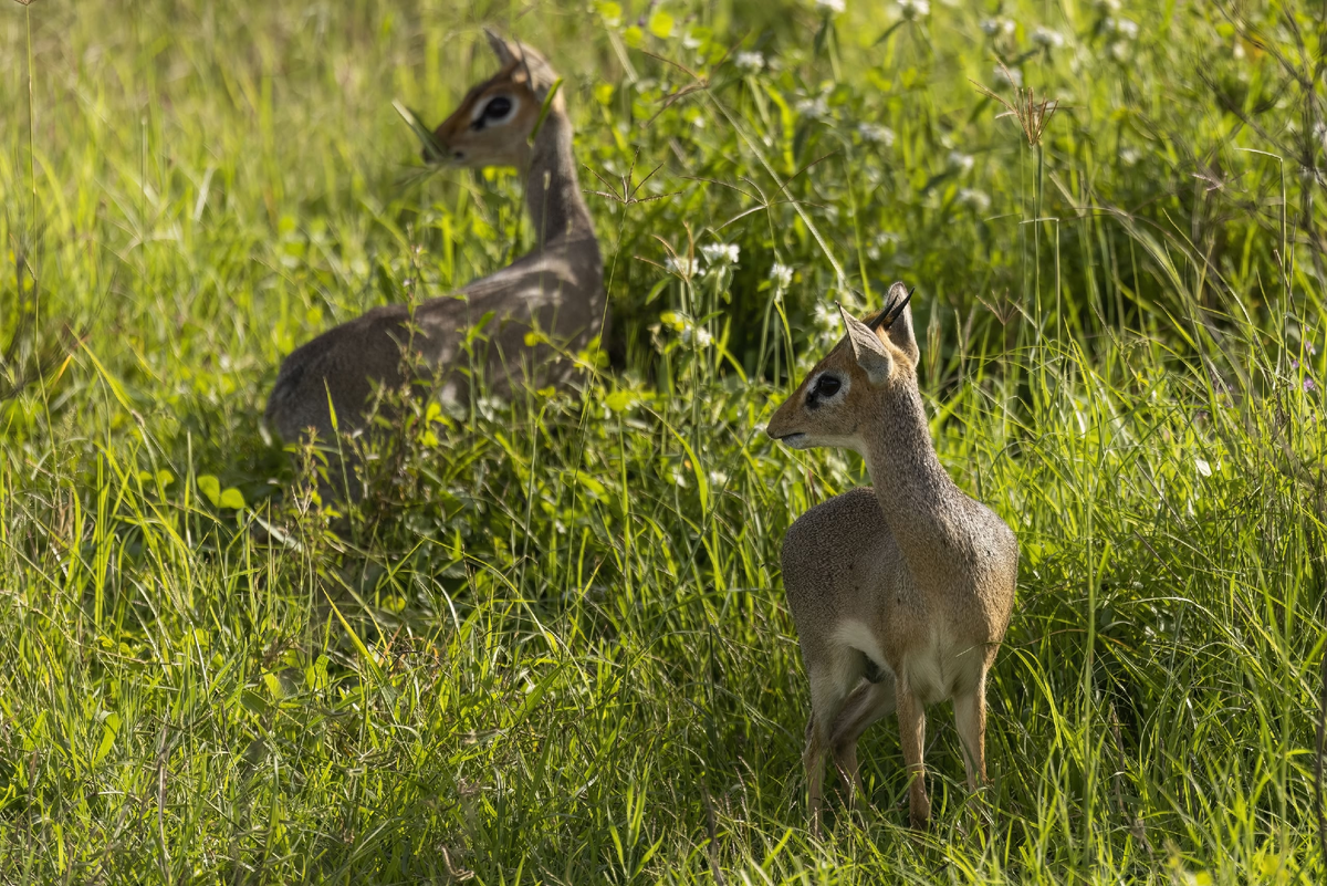 Справедливости ради, пропустить дикдика в зарослях травы несложно. В Танзании я снимаю дикдика Кирка — крупнейшего из дикдиков. Хотя слово «крупнейший» звучит почти издевательски. Ростом они 35–45 см, весят до 7 кг. Самки чуть больше, но в целом габариты антилопы лишь немногим больше размеров среднестатистической домашней кошки. Зато самцы носят рога. Правда, крошечные, — длиной всего 3-8 см. Нередко они скрыты под хохолком.