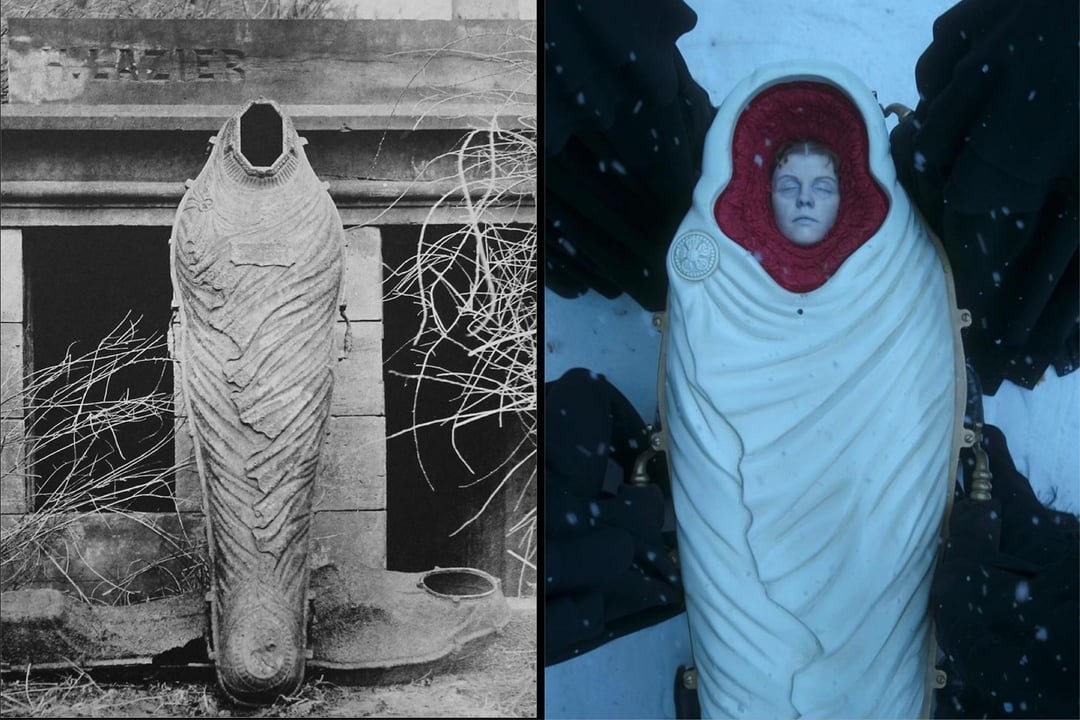 Гроб Фиска получил патент в 1848 году. Это воздухонепроницаемый гроб из кованого железа, характерный для похоронной паранойи викторианской эпохи. Его главными целями были защита от грунтовых вод, предотвращение распространения миазмов (считавшихся причиной болезней) и сохранение тела для будущего воскресения. Такие «безопасные» гробы, как показано во «Франкенштейне» Гильермо дель Торо (кадр справа), отражают глубокий страх XIX века перед преждевременным погребением и разложением.