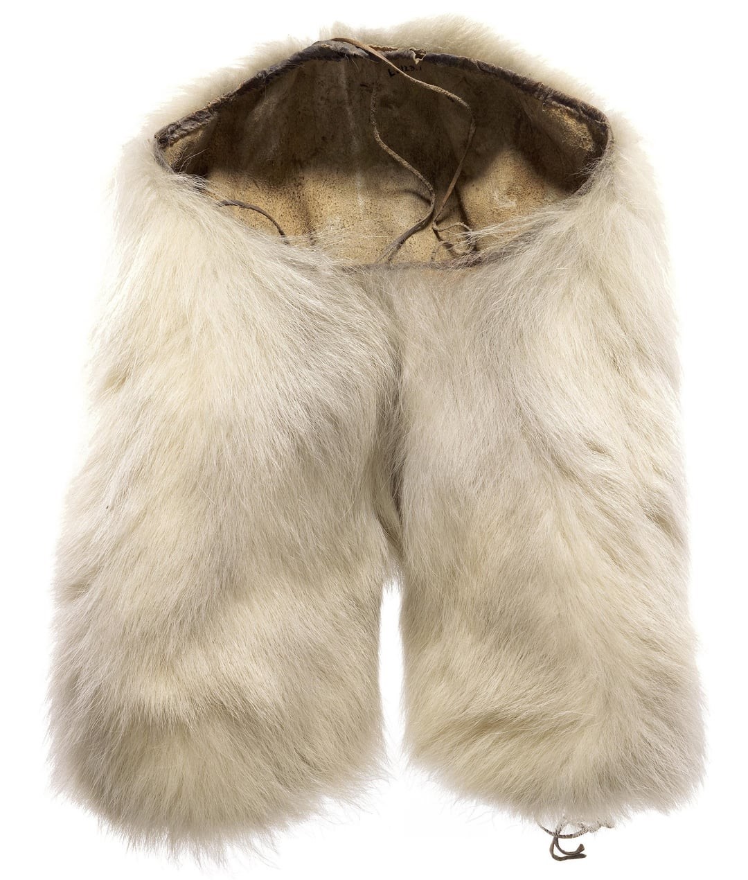 Подобная одежда, собранная европейцами в конце XIX века, была не просто тёплой — она обладала высочайшим статусом у инуитов. Мех самого могучего арктического хищника использовали для изготовления особой охотничьей экипировки, веря, что он передаёт человеку силу и выносливость зверя. Этот предмет — пример как практической адаптации, так и духовной связи с миром животных.