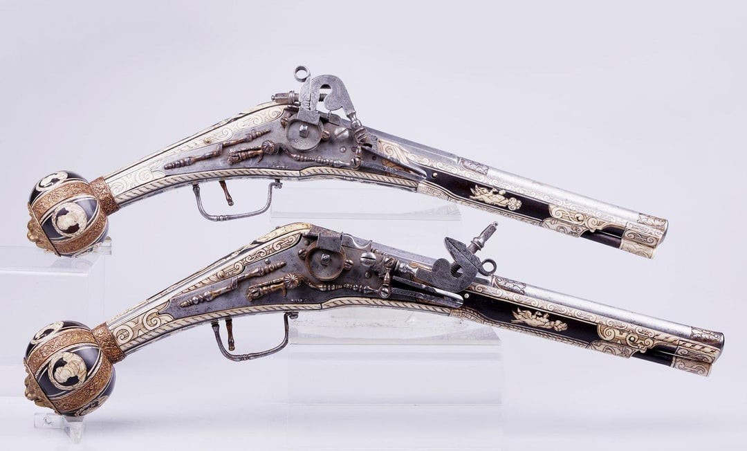 4. Пара колесцовых пистолетов. Аугсбург, Священная Римская империя, 1580 г. Материалы: сталь, дерево, латунь, кость
