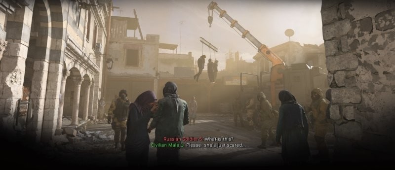 Чтобы закрепить материал, авторы игры показывают самосвалы трупов с мирными курдами, местные стройбаты и, конечно, публичное повешение российскими солдатами предателей на строительной шпале».