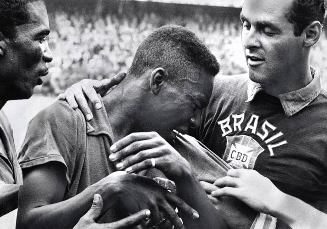 5. Пеле в день первой победы Бразилии на чемпионате мира по футболу, 29 июня 1958 года. Матч со Швецией завершился со счётом 5:2, два гола забил Пеле