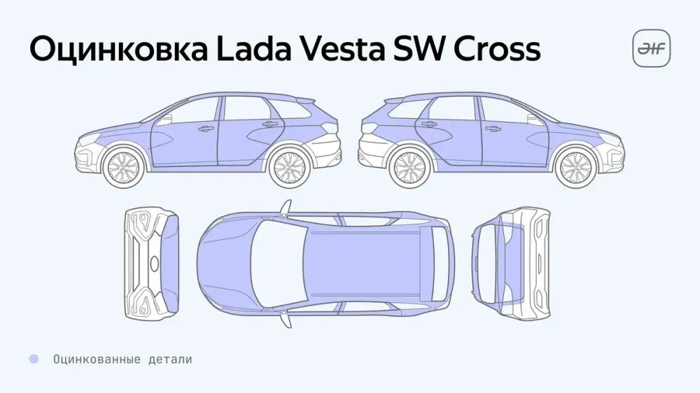 Оценка количества оцинкованных деталей в конструкции каждой конкретной модели проводилась инструментально. Эксперты пришли к выводу, что наибольшим числом защищённых компонентов из всех участников теста обладает Lada Vesta SW Cross, у которой цинковое покрытие присутствует на всех деталях без исключения. Lada Iskra уступила немного: у неё цинк отсутствует главным образом на крыше. На третье место поставили Geely Emgrand, отличающийся незащищённым проёмом багажного отсека.