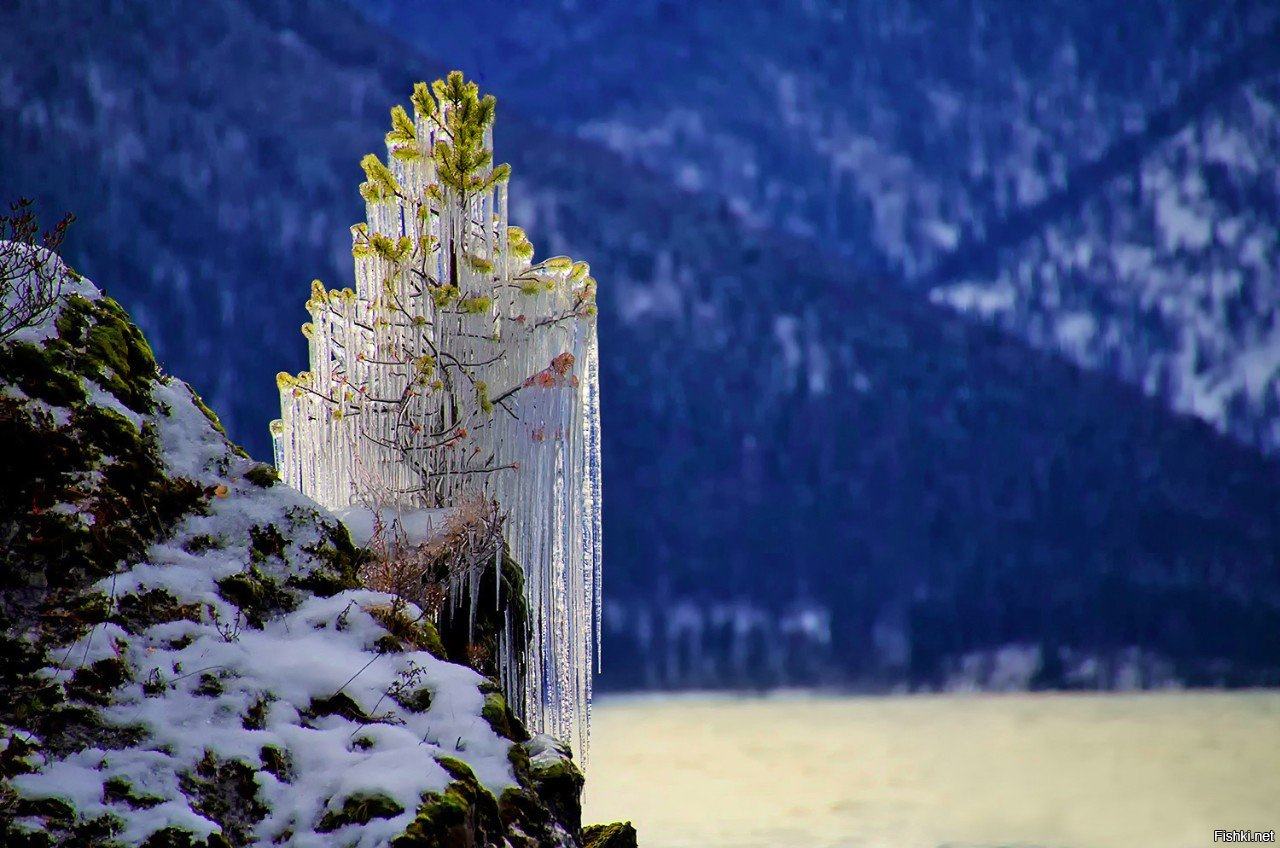 Сосна в ледяном наряде на берегу Телецкого озера. Горный Алтай