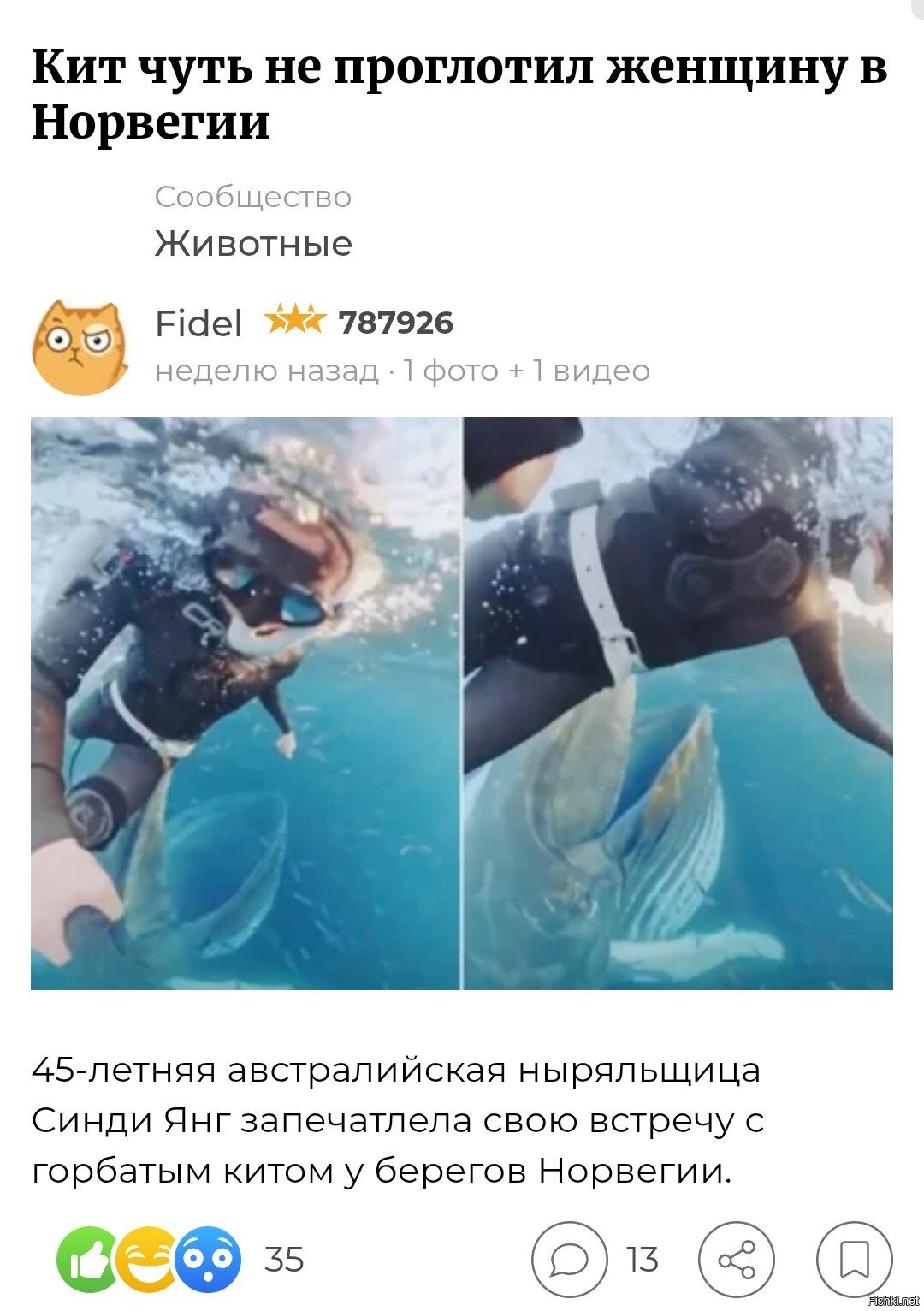 Во время обычного погружения девушка-дайвер неожиданно столкнулась с гигантским китом, который подплыл так близко, что ещё немного — и она могла оказаться у него во рту. Момент, полон напряжения и эмоций, снят на видео и заставляет сердце биться быстрее.