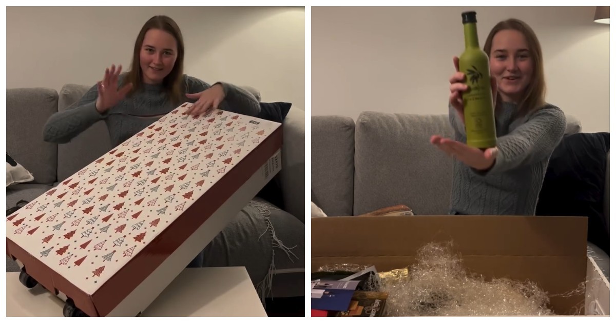 В праздничном наборе оказались мясные деликатесы — нога хамона и три вида сыровяленой колбасы, алкоголь: два красных вина и два игристых, сладости — туррон, шоколад и конфеты, а также банка тунца и бутылка оливкового масла.