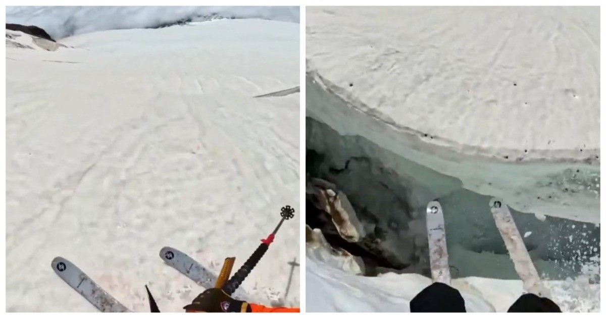 Любитель острых ощущения чуть не сорвался в трещину в леднике во время спуска. Напряженный момент попал на видео.