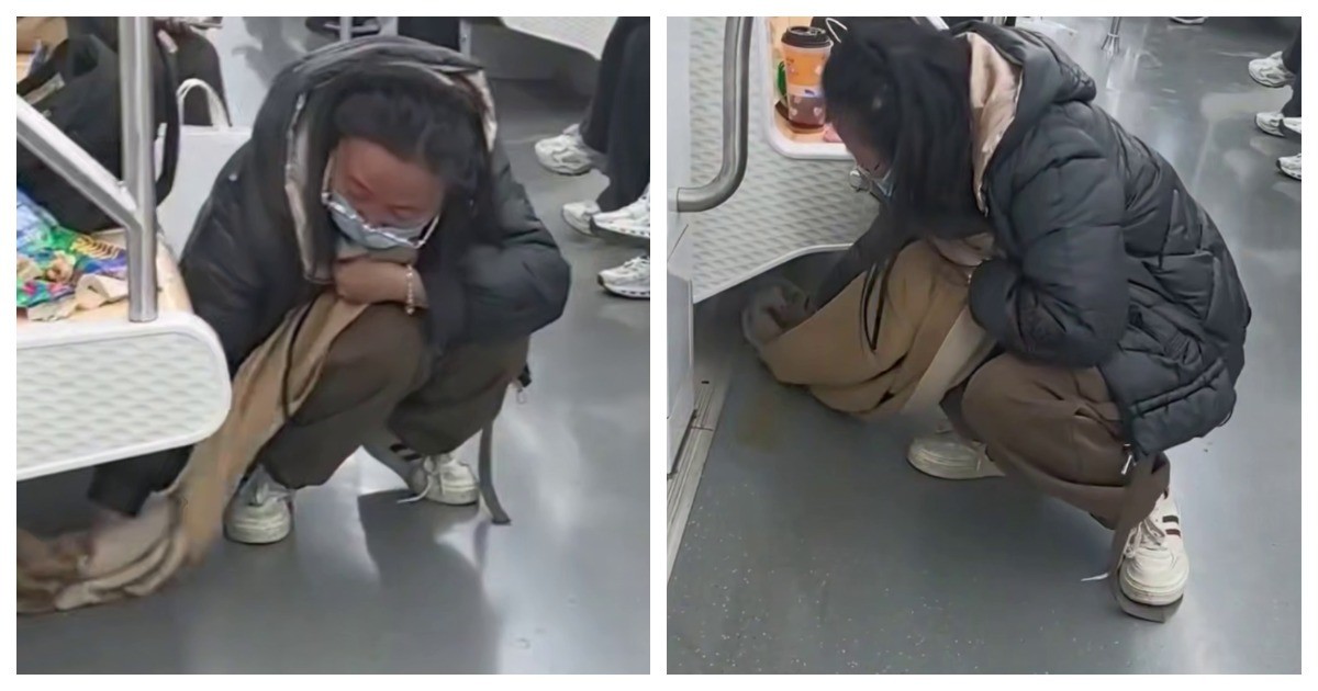 В метро Сучжоу, Китай, пассажирка случайно пролила напиток во время поездки. Женщина начала вытирать жидкость собственным шарфом.