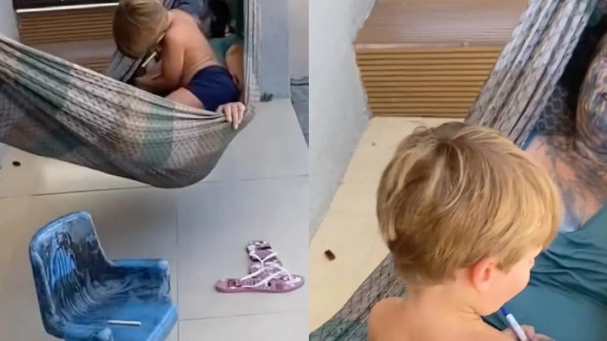 Женщина ненадолго оставила сына под присмотром бабушки. Вернувшись позже, она решила заглянуть к ним и неожиданно обнаружила, что бабушка отдыхает, а внук тем временем нашёл себе очень творческое занятие.