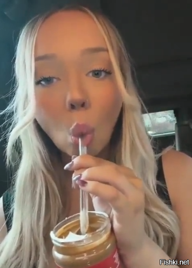 Миловидная девушка продемонстрировала один из своих талантов. Она полакомилась арахисовой пастой через трубочку.
